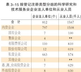 在科学研究和技术服务业企业法人单位从业人员中,内资企业占96.23%,港、澳、台商投资企业占1.84%,外商投资企业占1.91%(详见表3-15)。